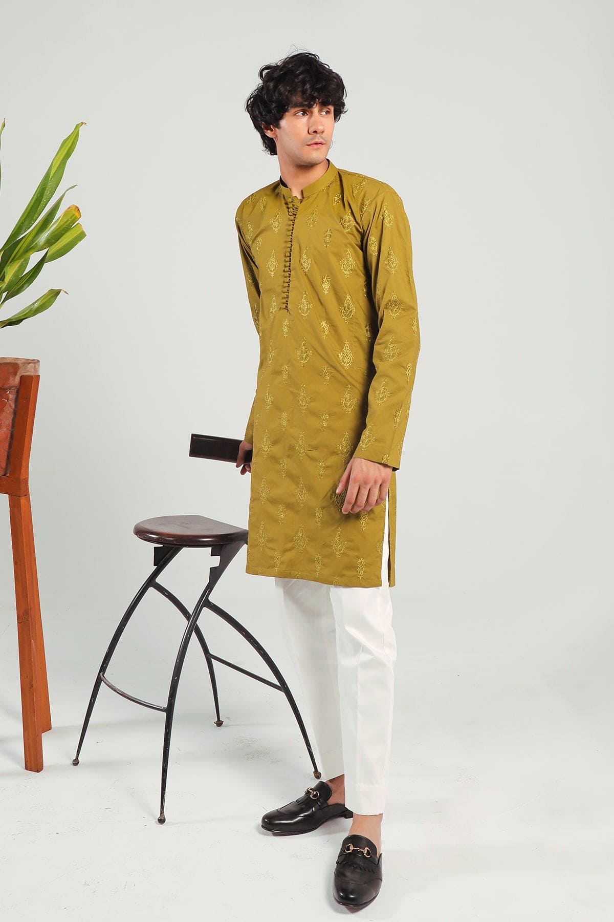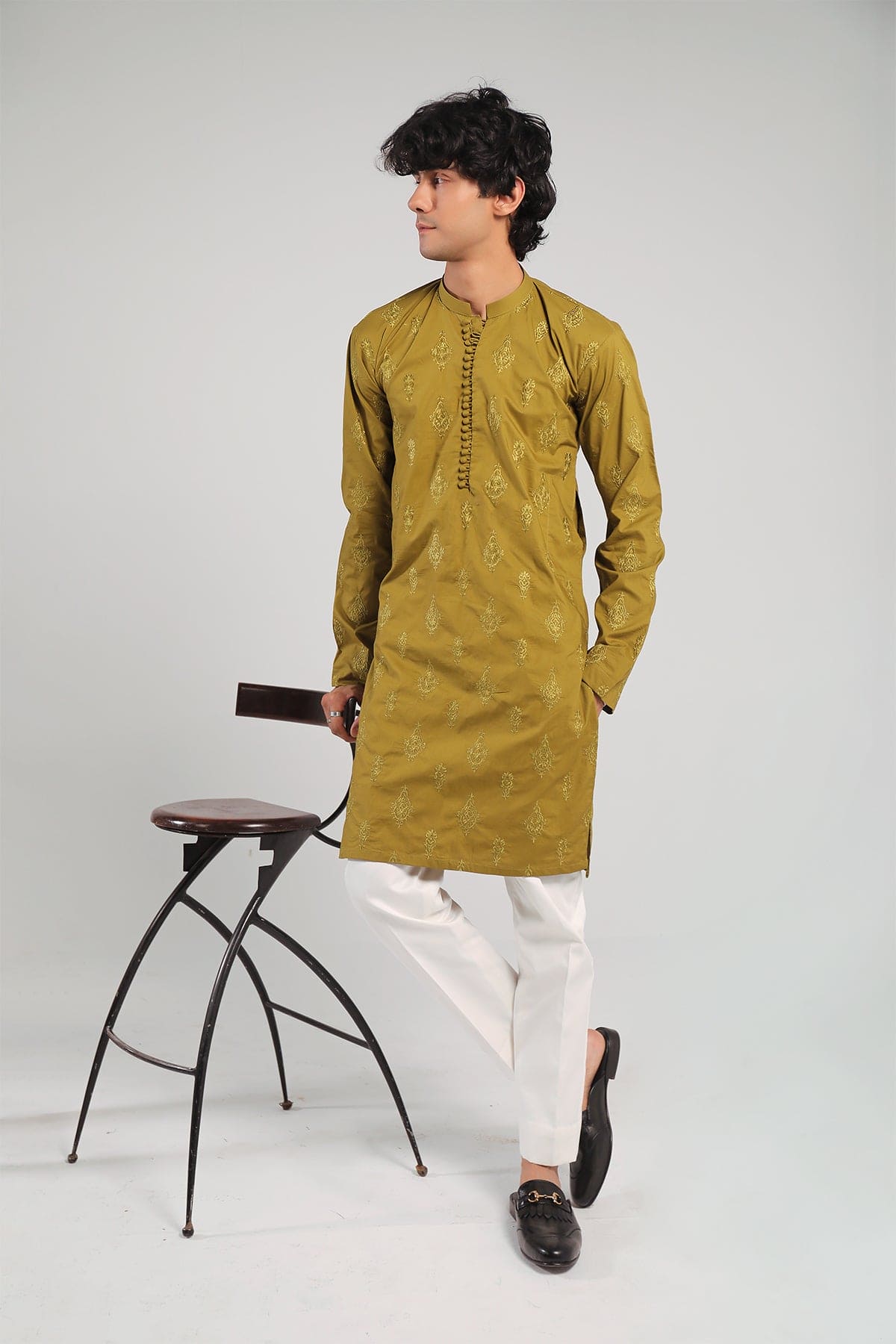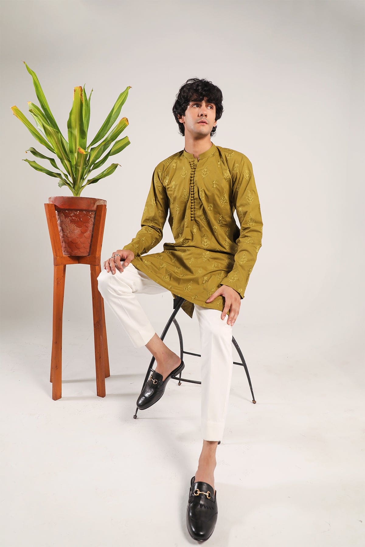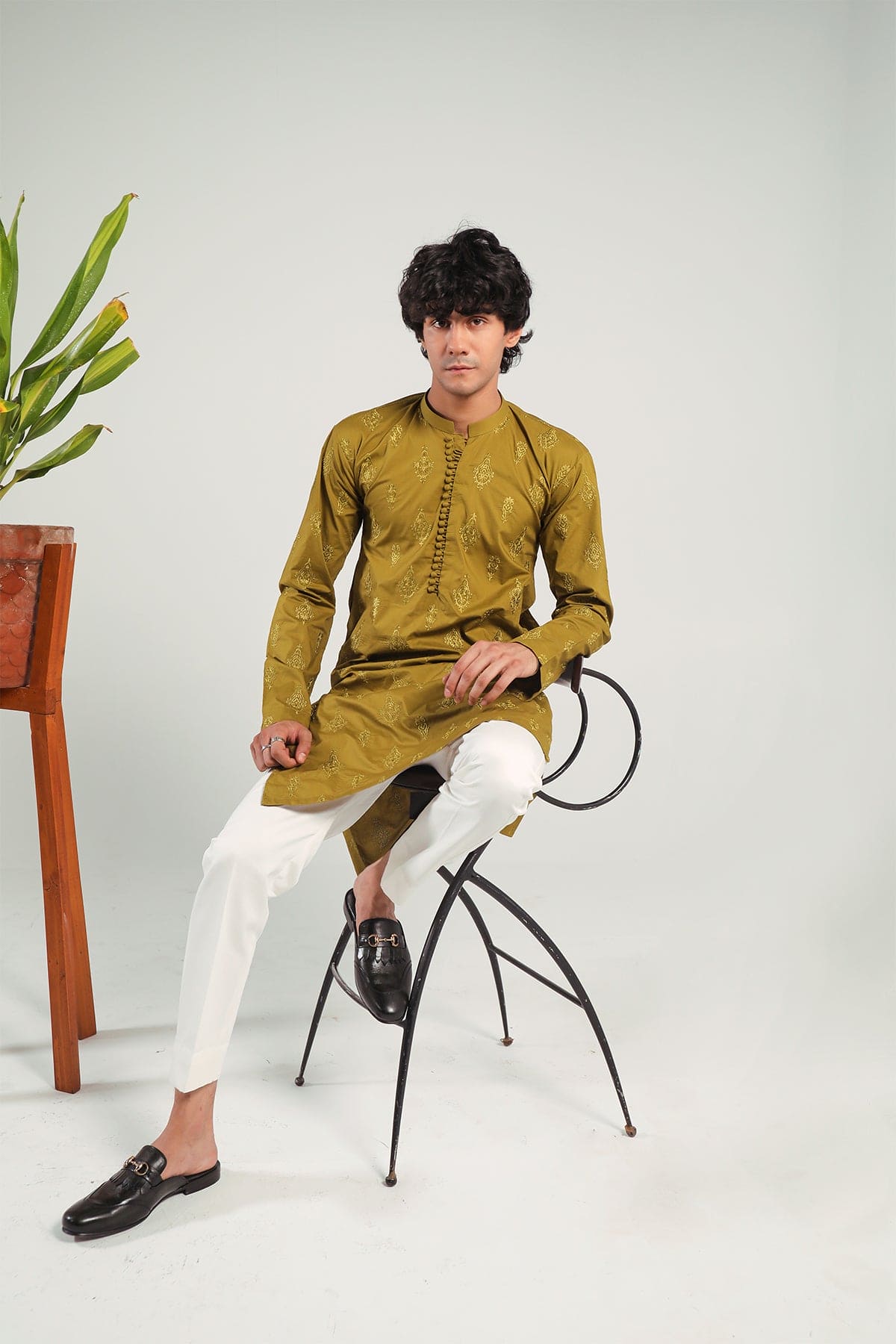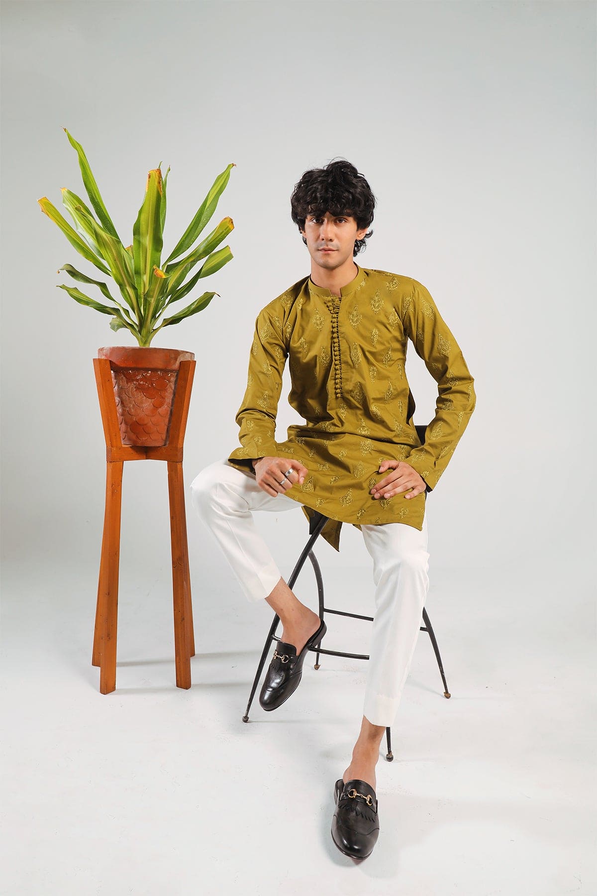 BARIS our new to this collection in moss color having tropical cotton fabric as a base with embroidered details on it.