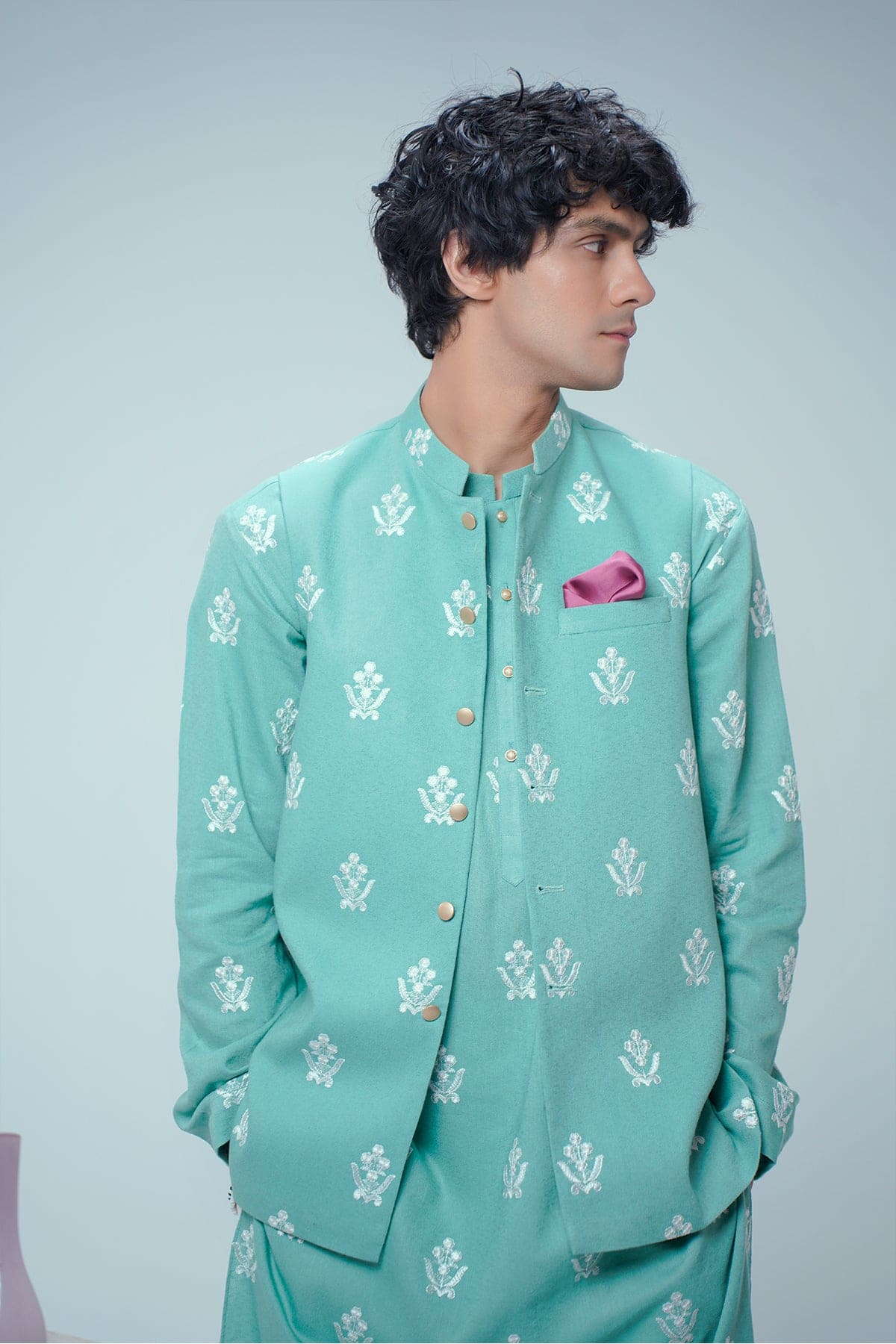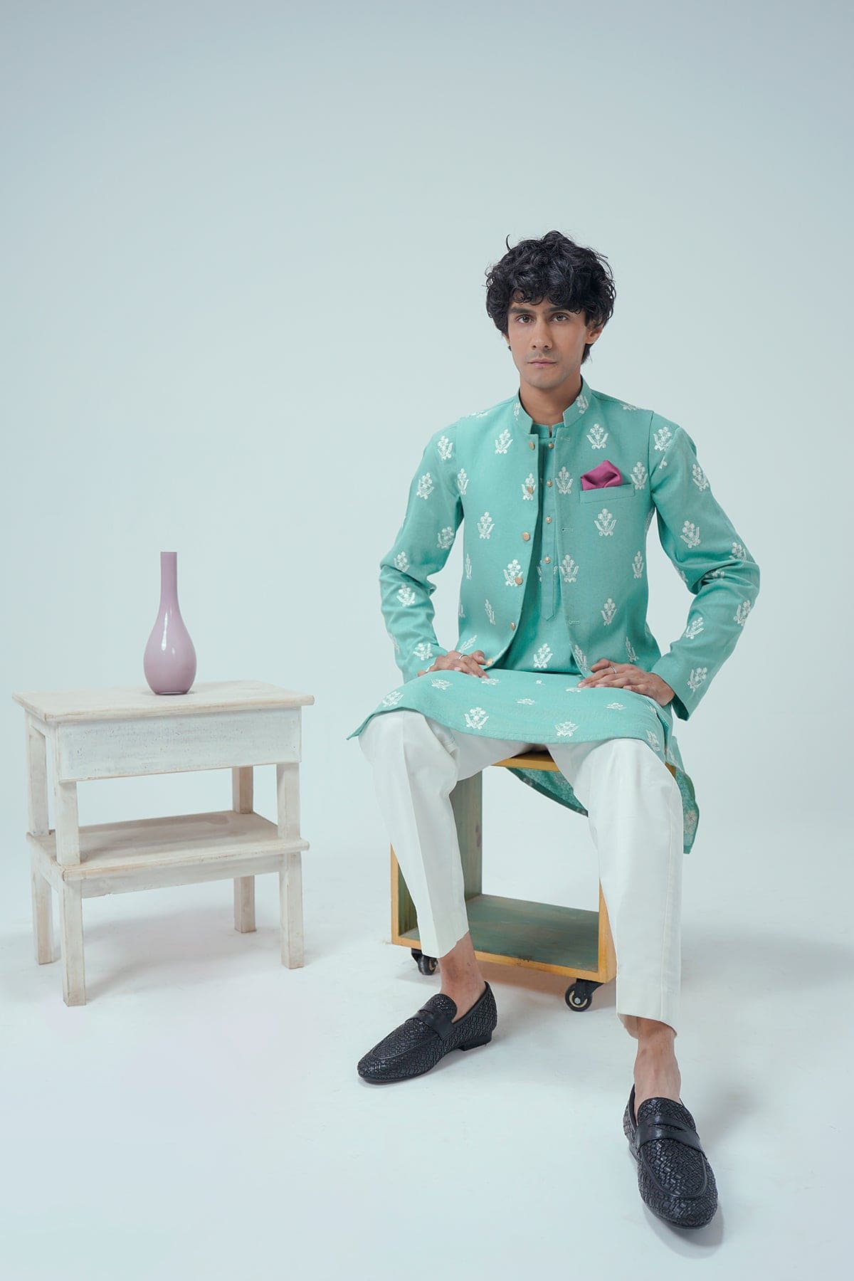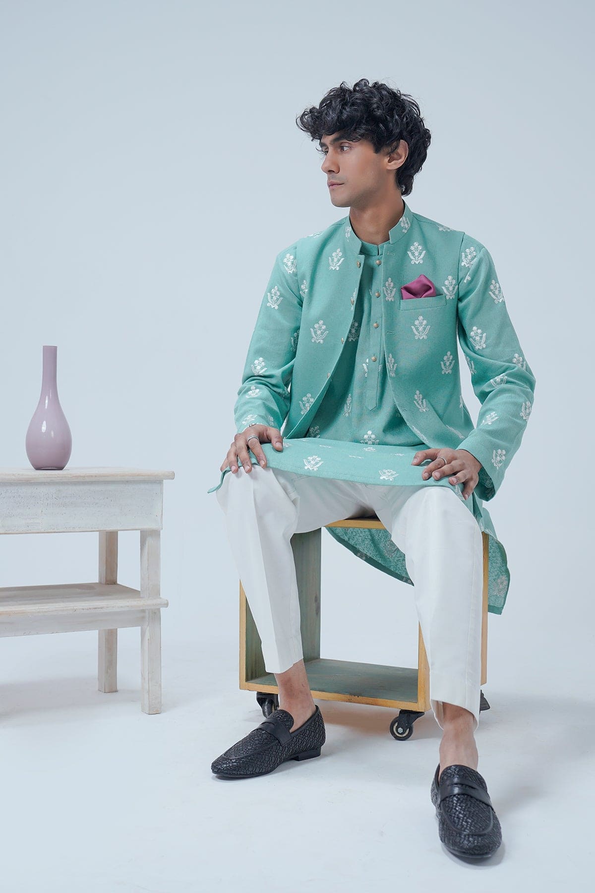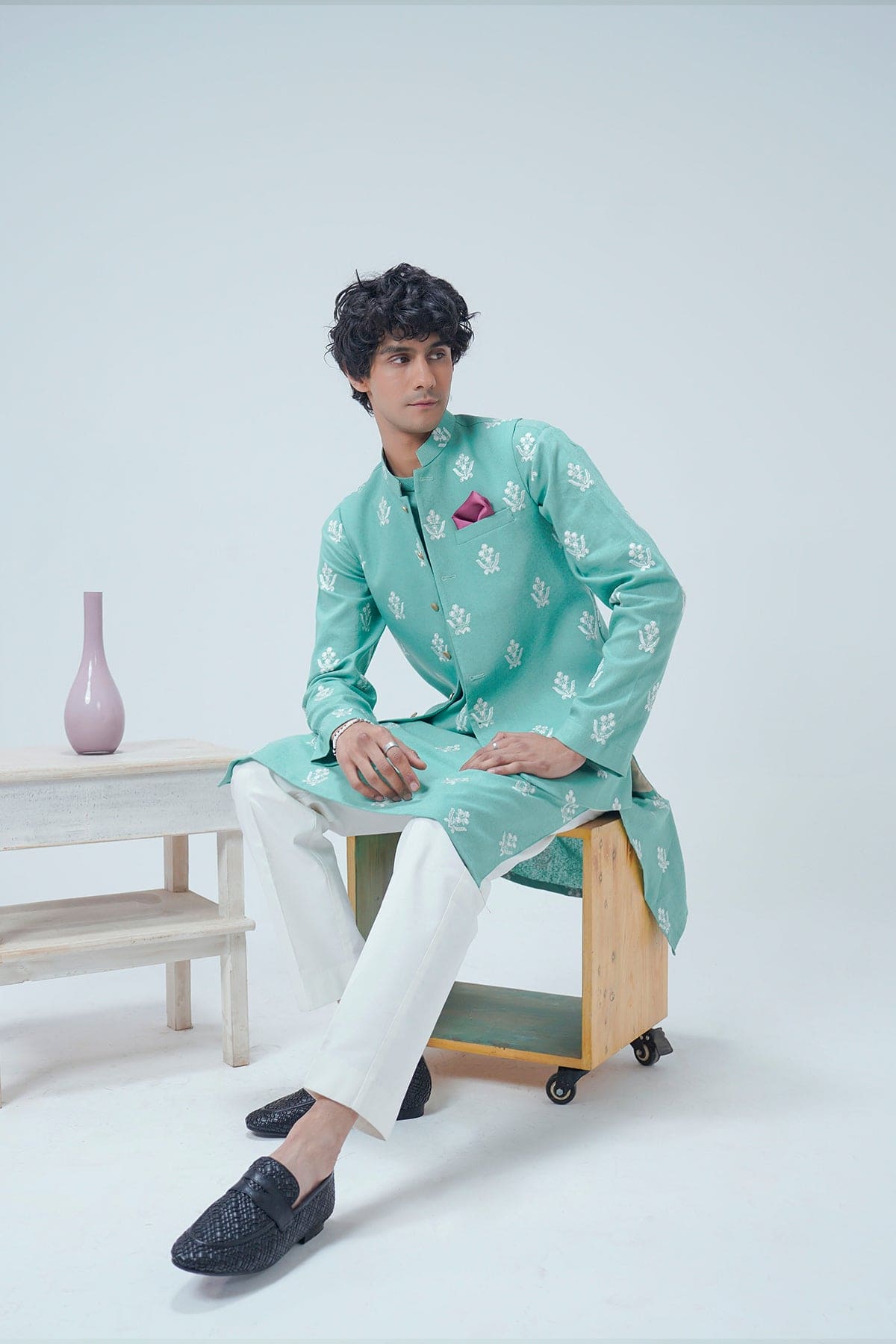 This Ensemble stands out as an embodiment of sophistication and luxury, crafted with pure finesse and elegant floral embroidery, pearl white lowers adds an enigmatic charm to the entire Ebdalian look.