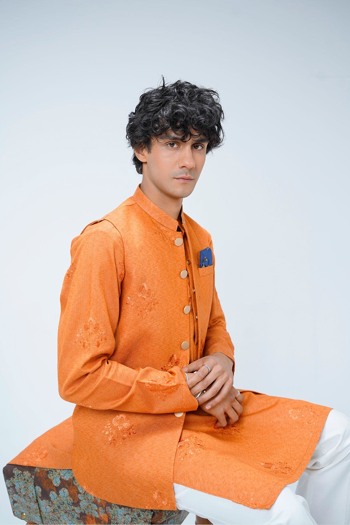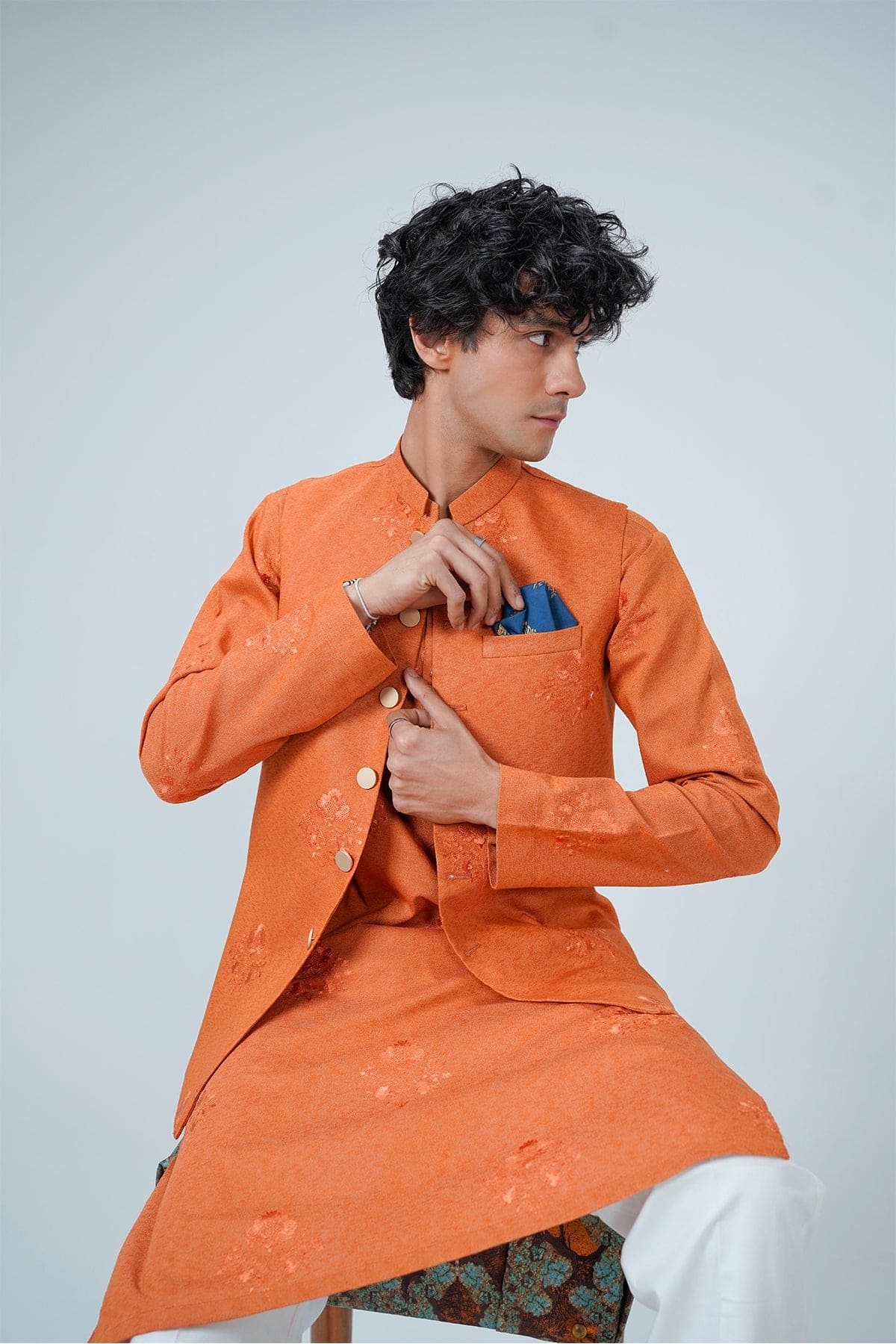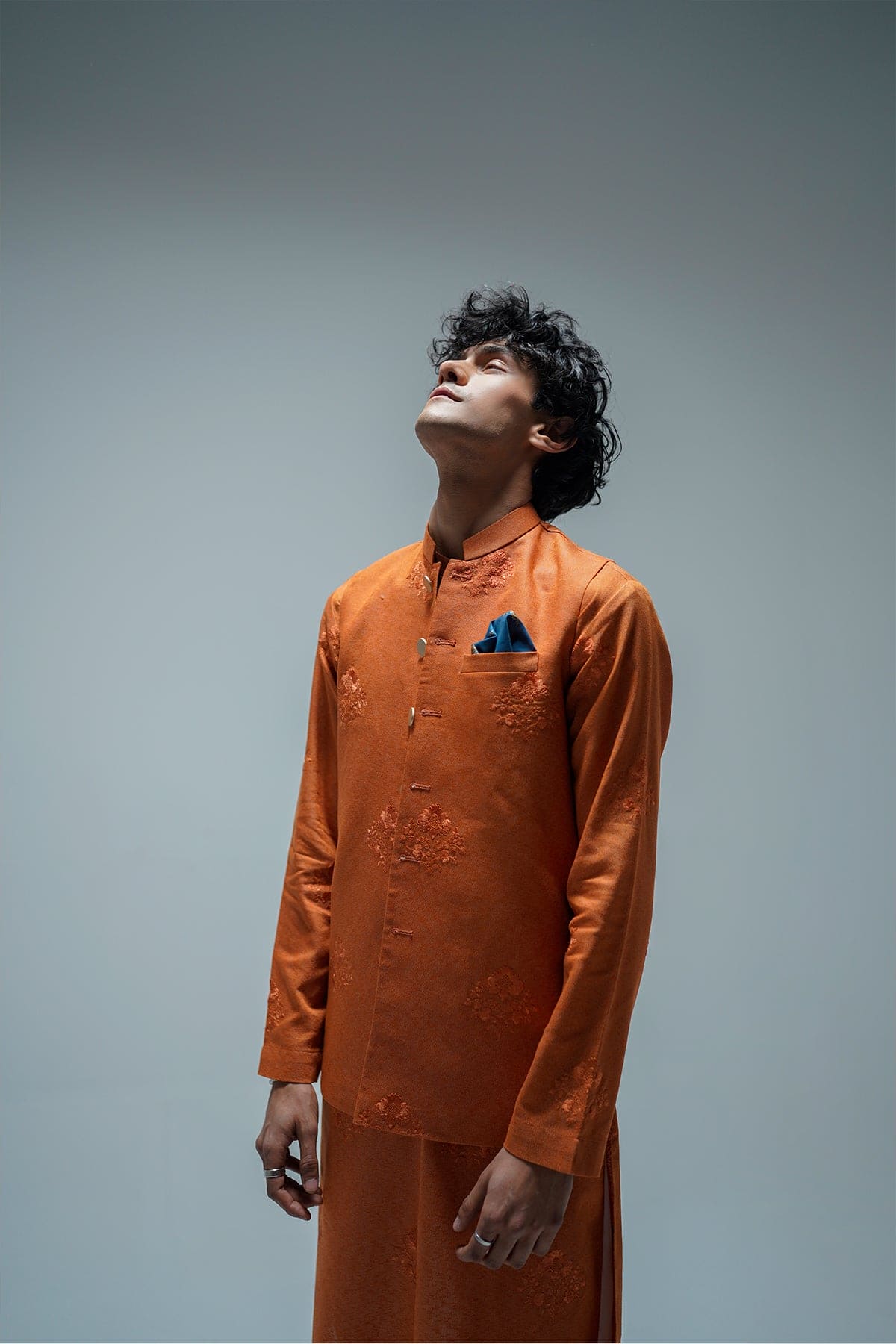ORAAN, the subtle orange set comes with a straight cut cotton karandi shirt with floral pattern embroidery with finease details on neckline and sleaves