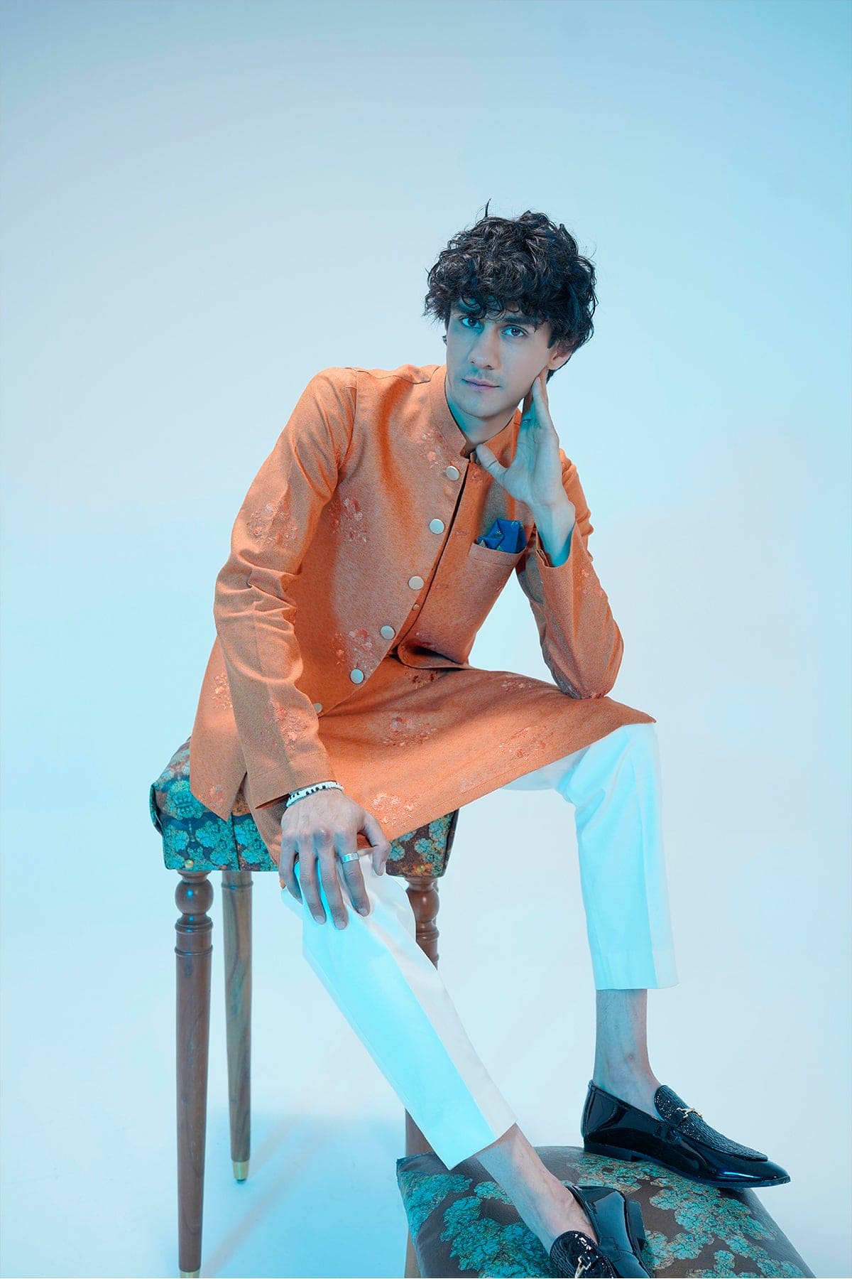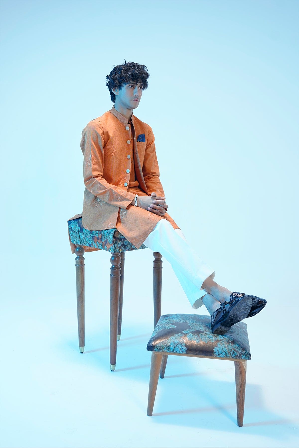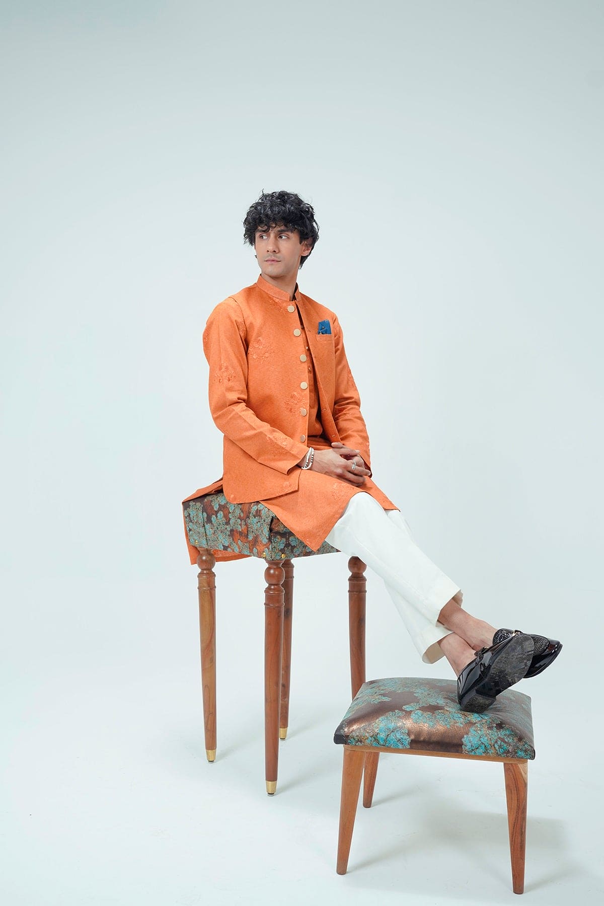 ORAAN, the subtle orange set comes with a straight cut cotton karandi shirt with floral pattern embroidery with finease details on neckline and sleaves