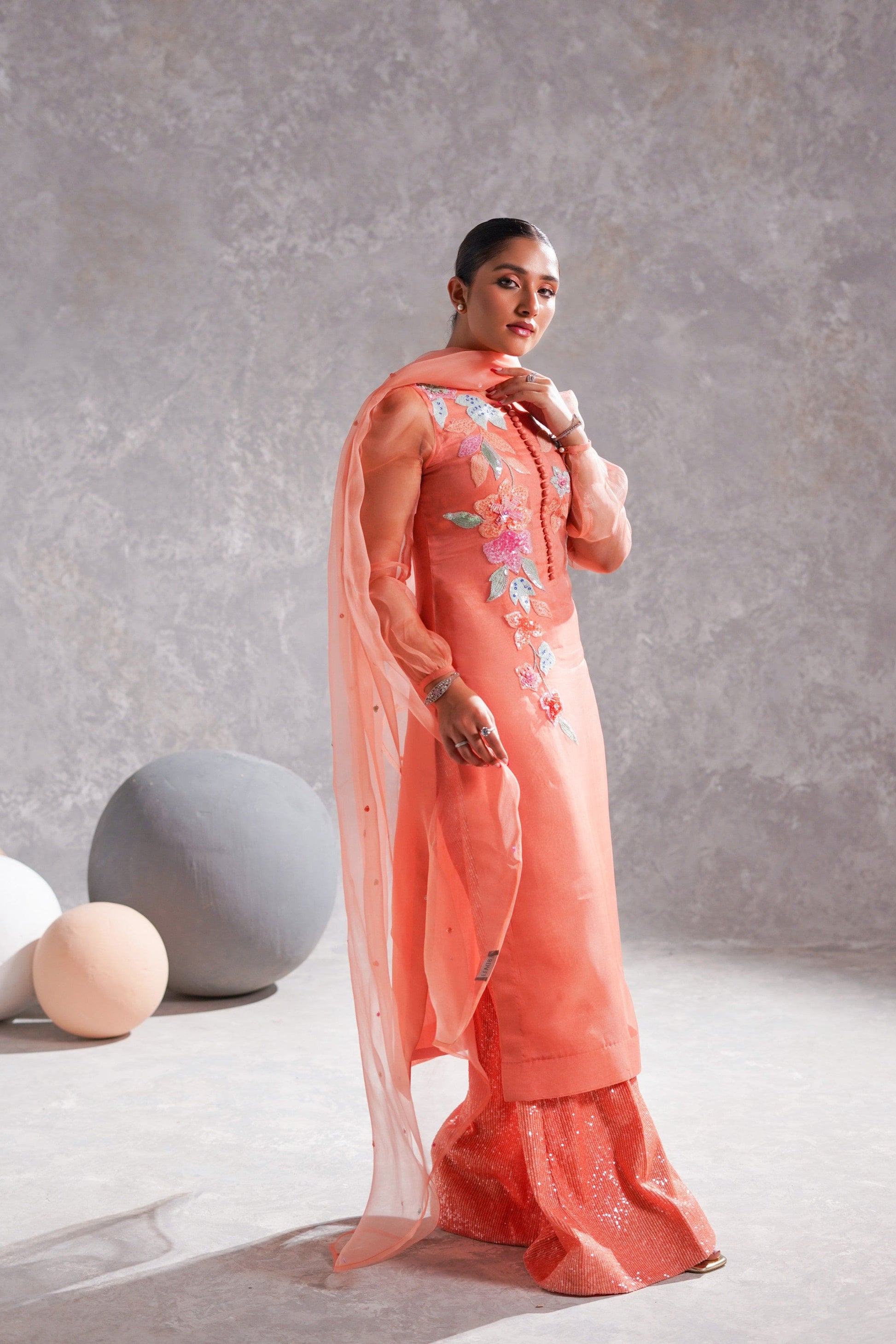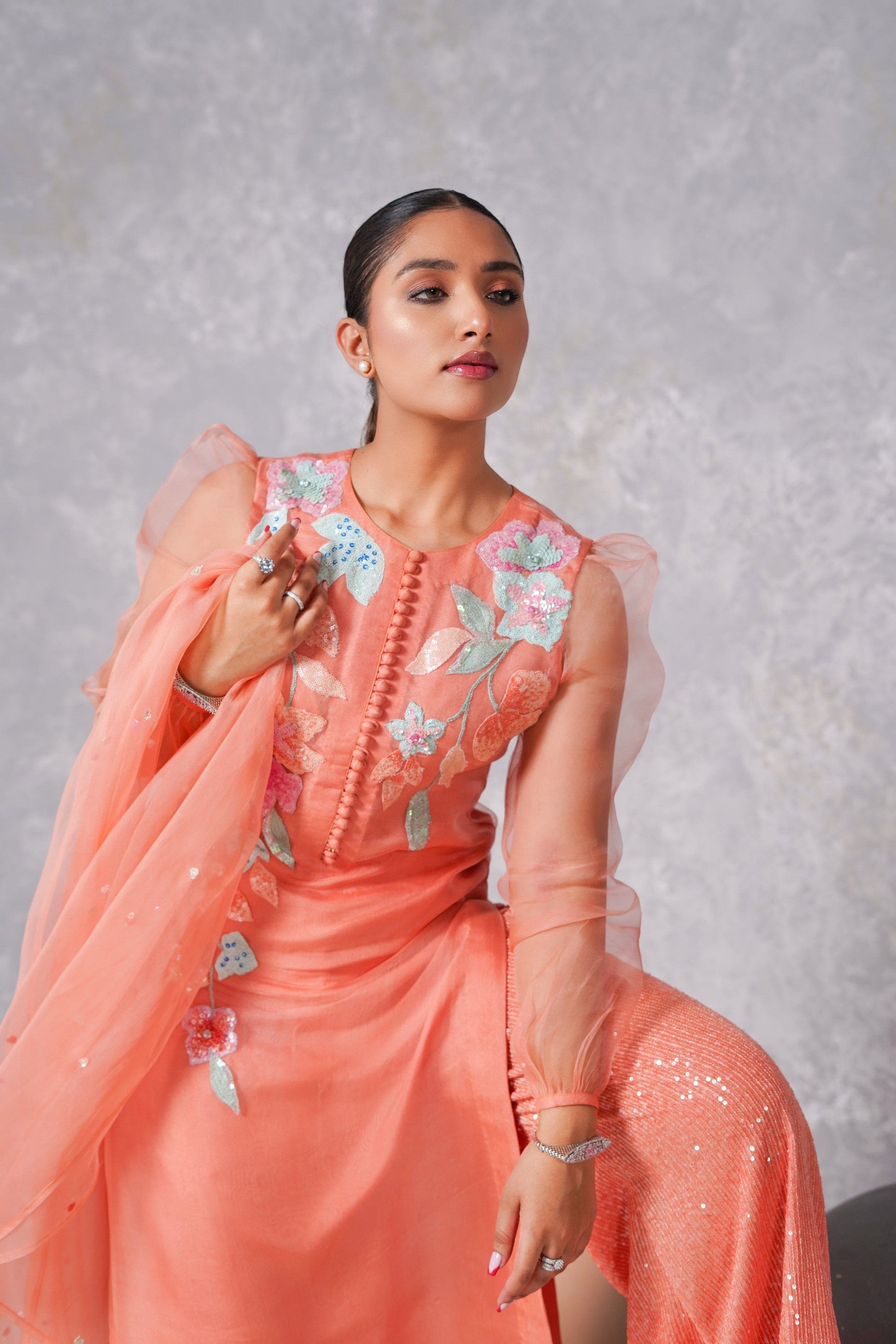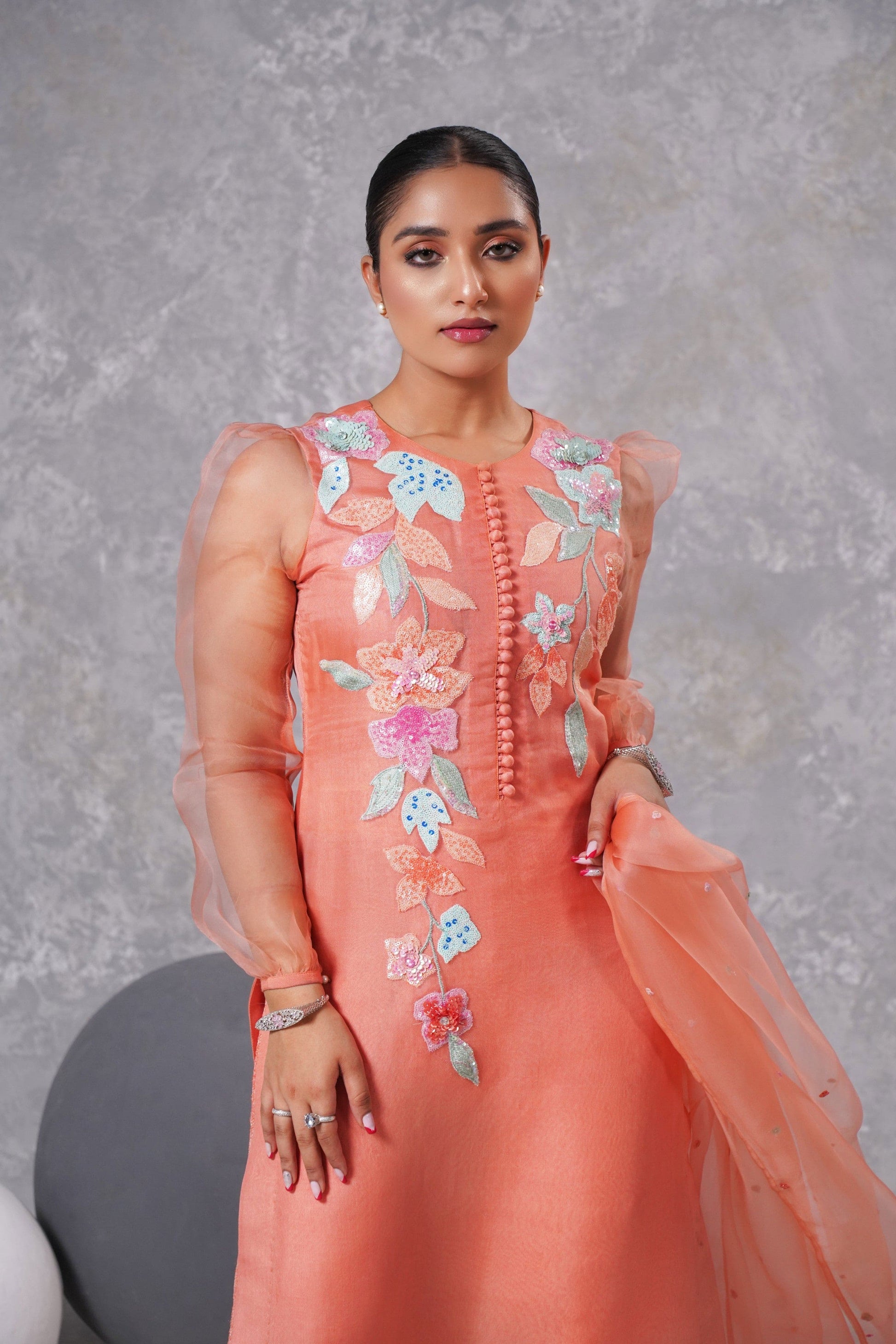 A splendid peachy orange ensemble, its shirt is made in organza with intricate small bunches of sequins flowers& beads in rust, orange and seagreen along with baby pink, rust and orange sequins spreaded all over it.