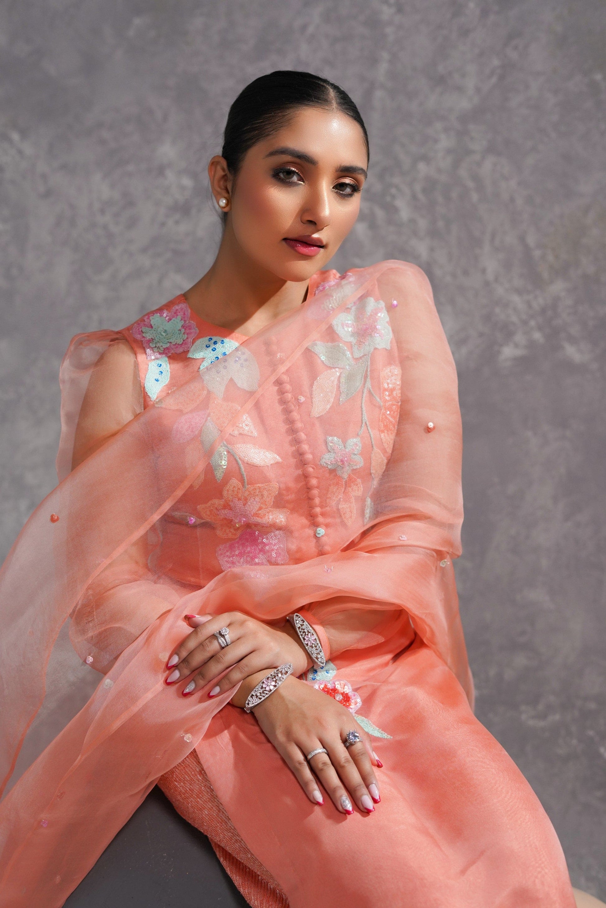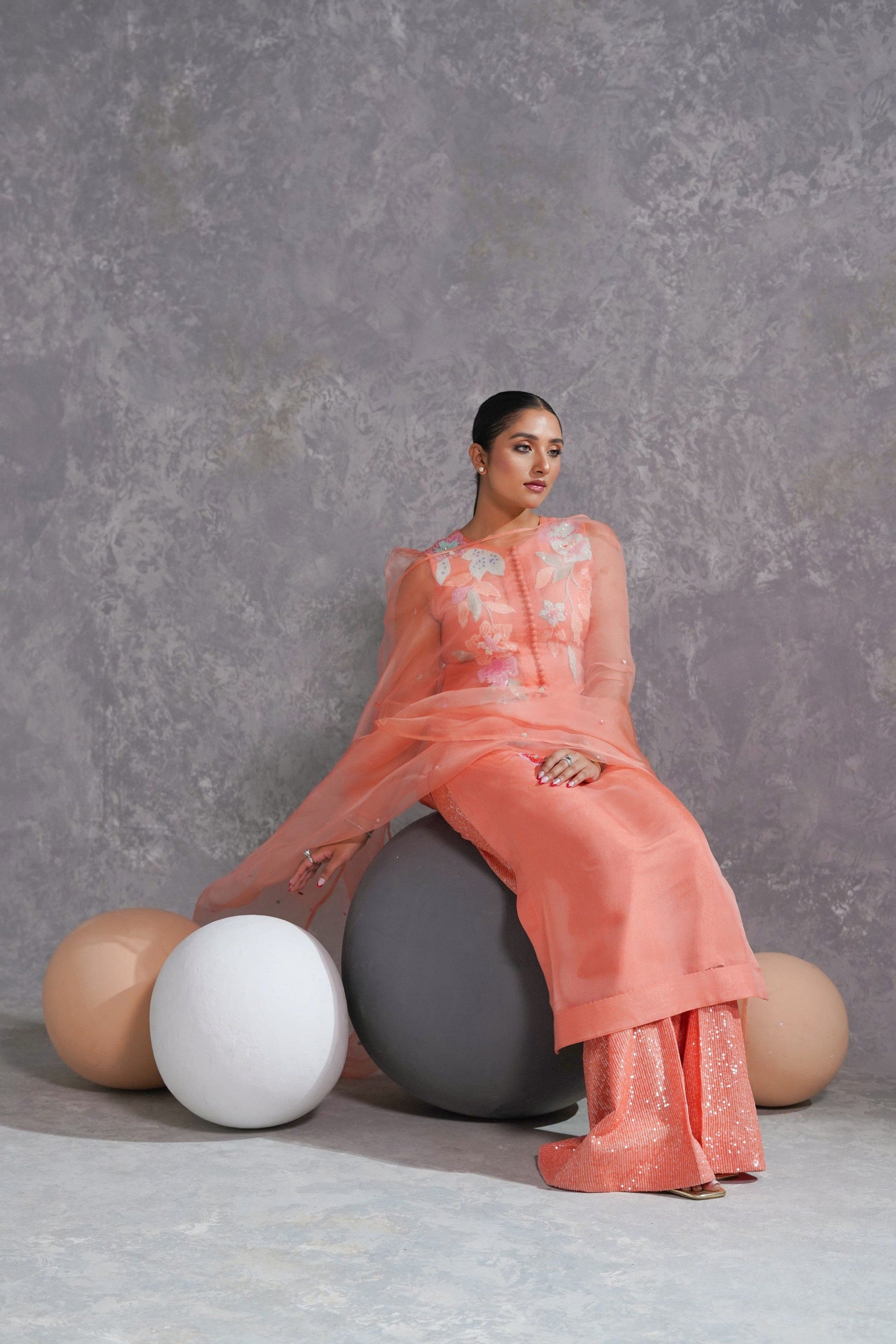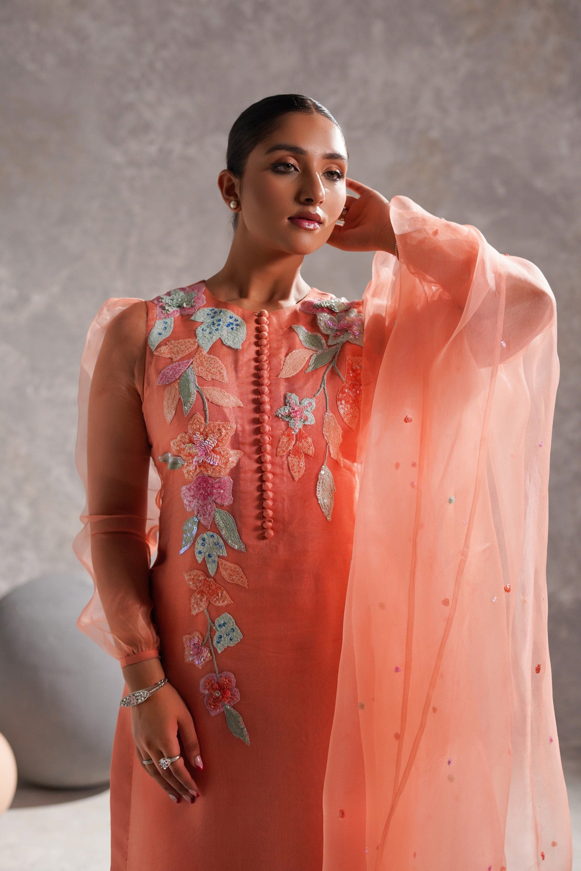 A splendid peachy orange ensemble, its shirt is made in organza with intricate small bunches of sequins flowers& beads in rust, orange and seagreen along with baby pink, rust and orange sequins spreaded all over it.