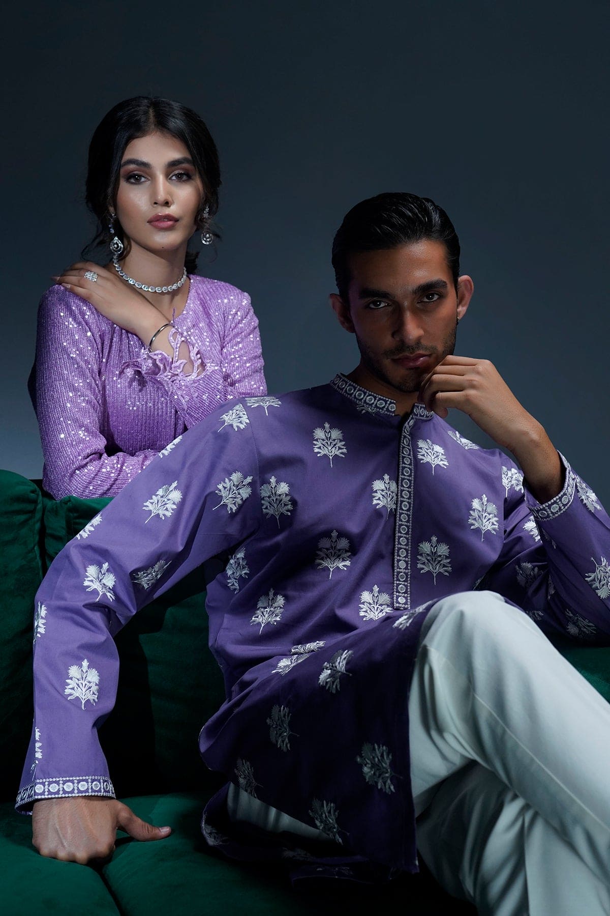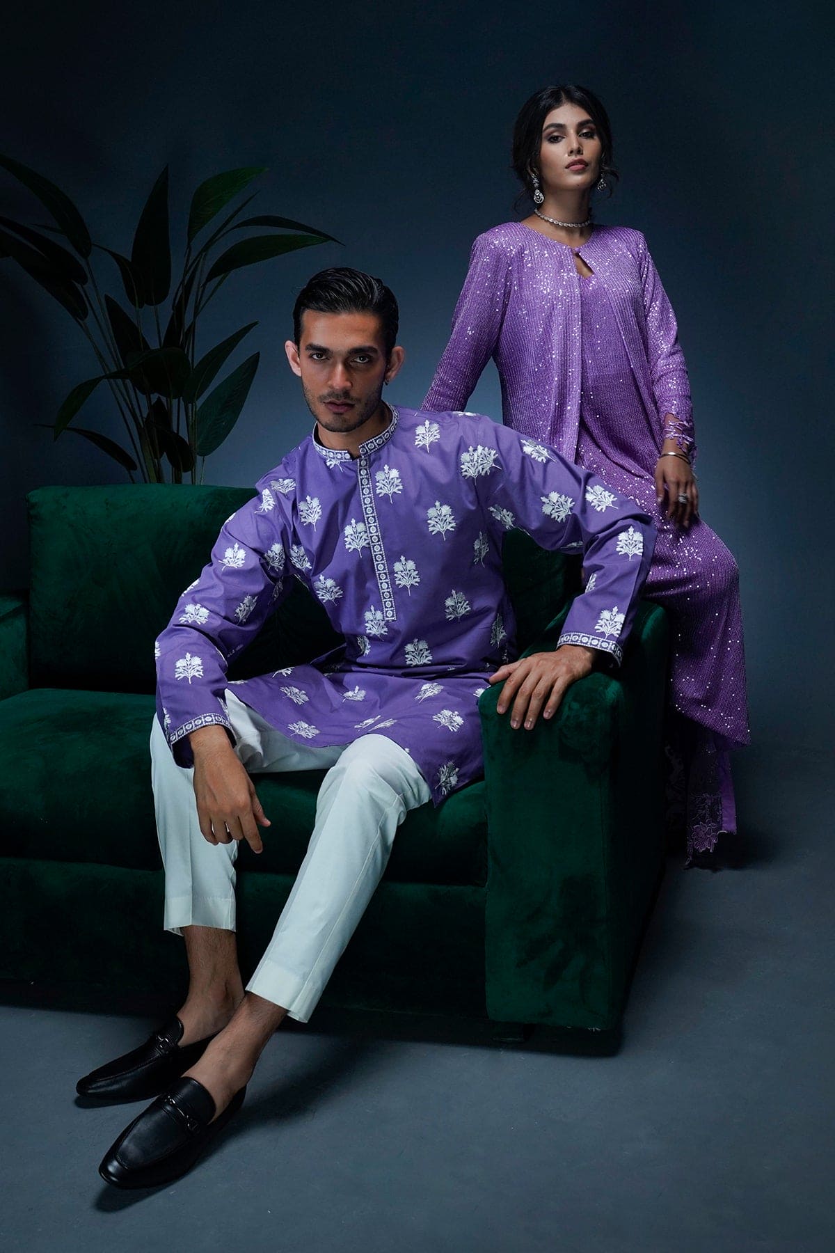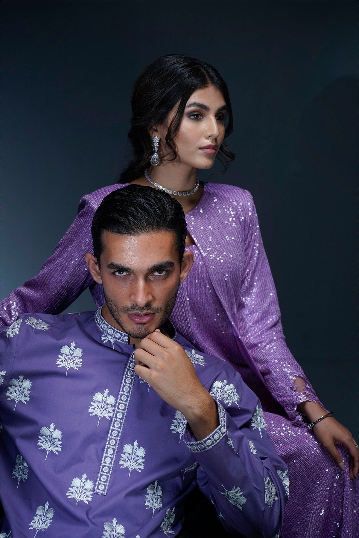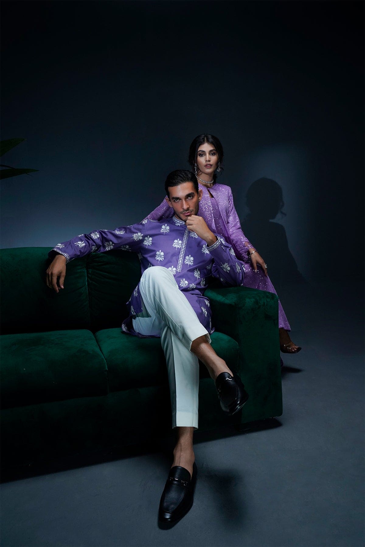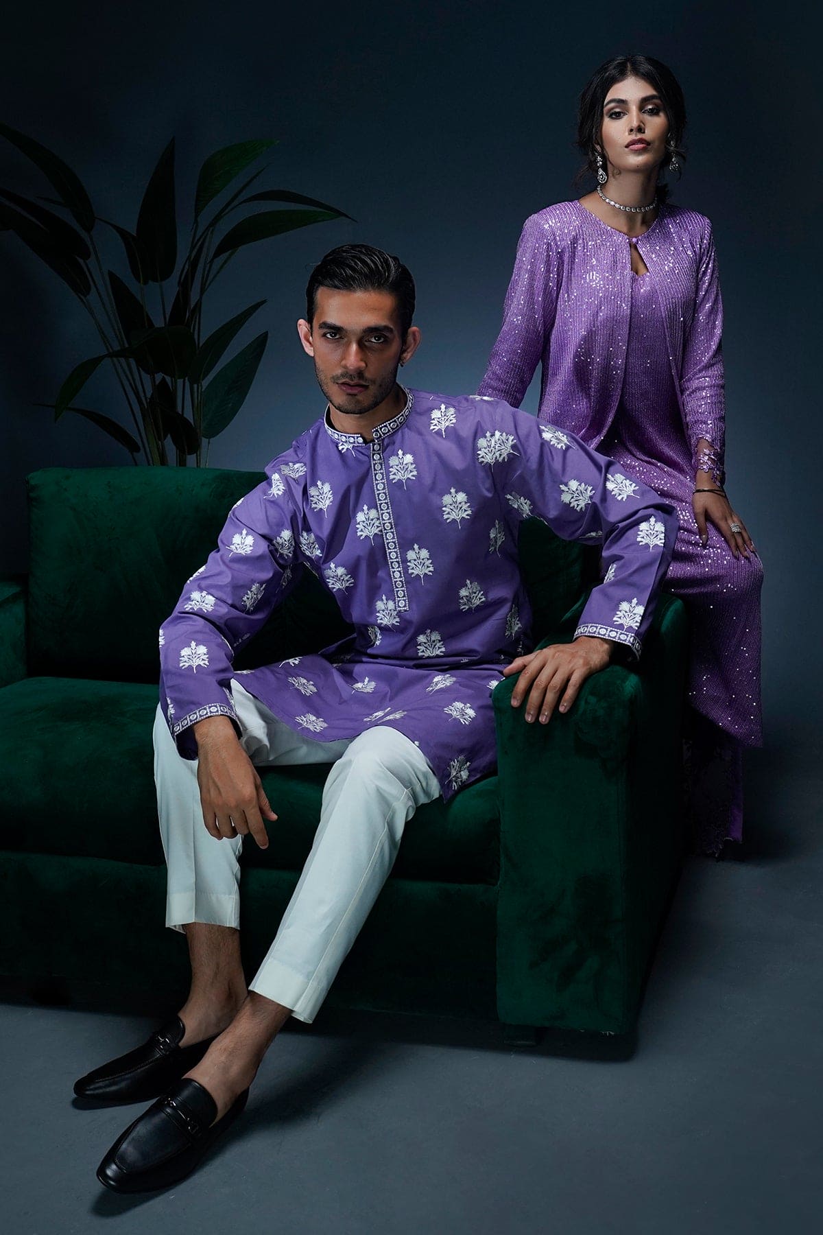 Puhaze by EBDALI is the chic glam color one can opt for too appealing and mesmerizing. The white embroidery balance out the garment and makes it pop on the surface color. Paired with satin pants.