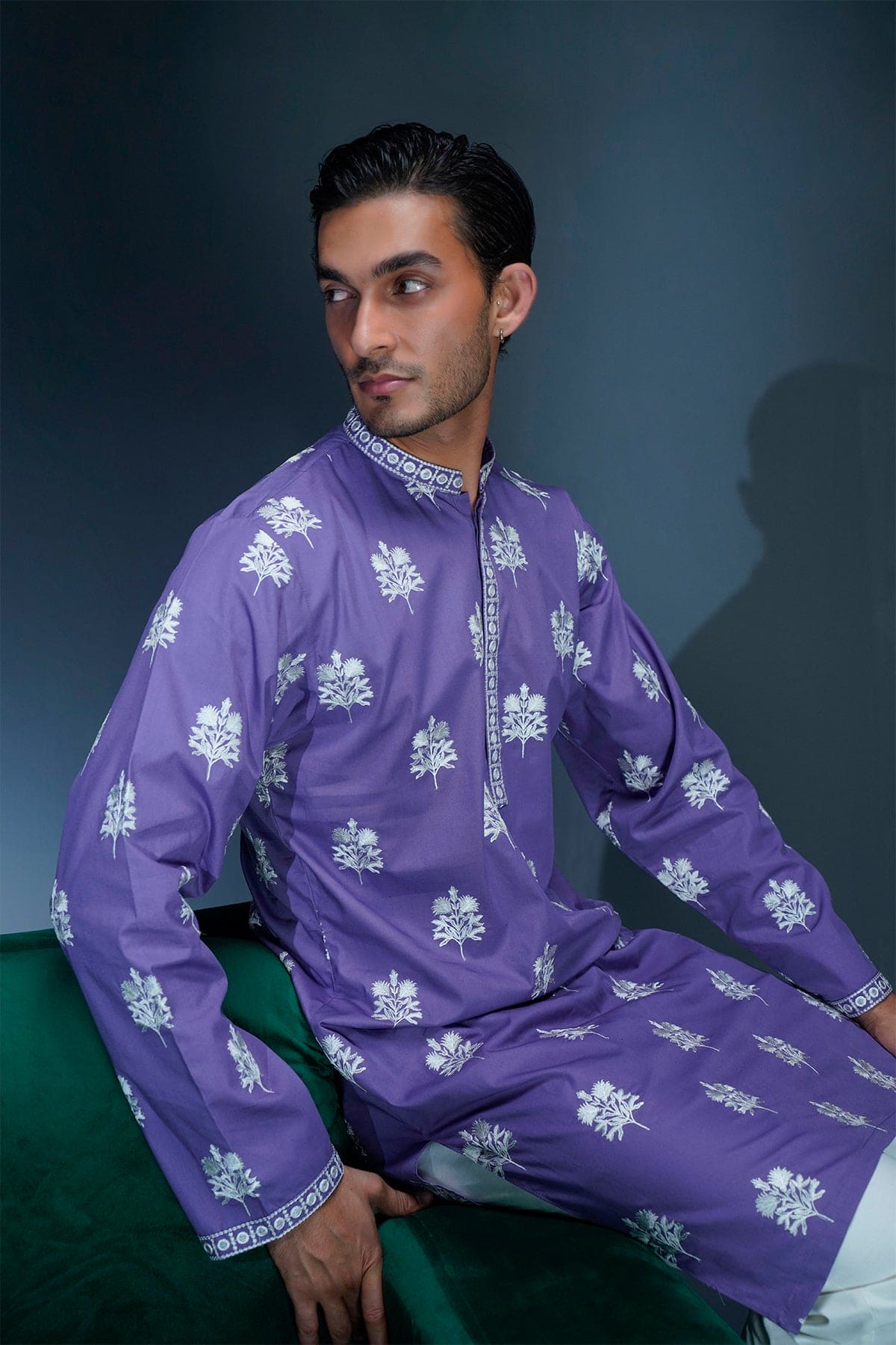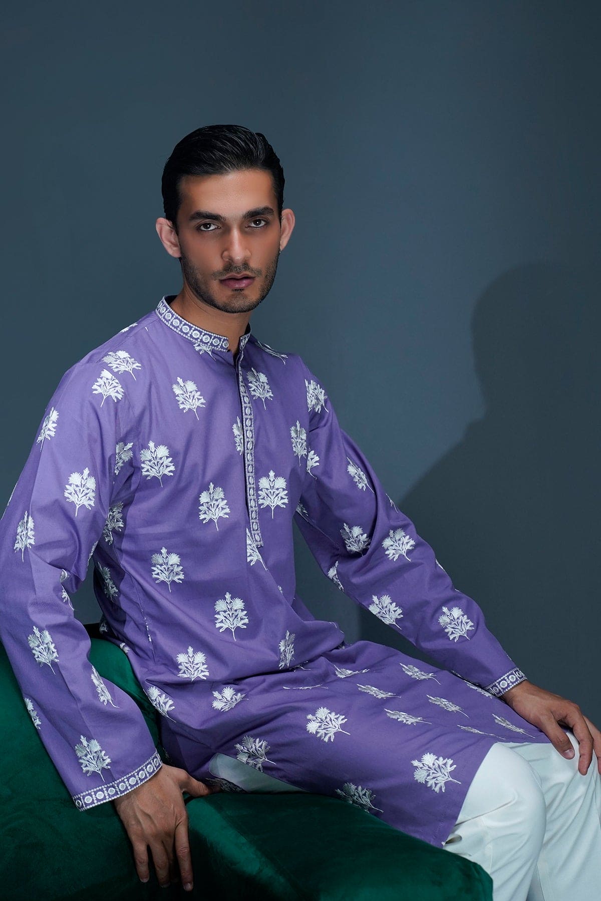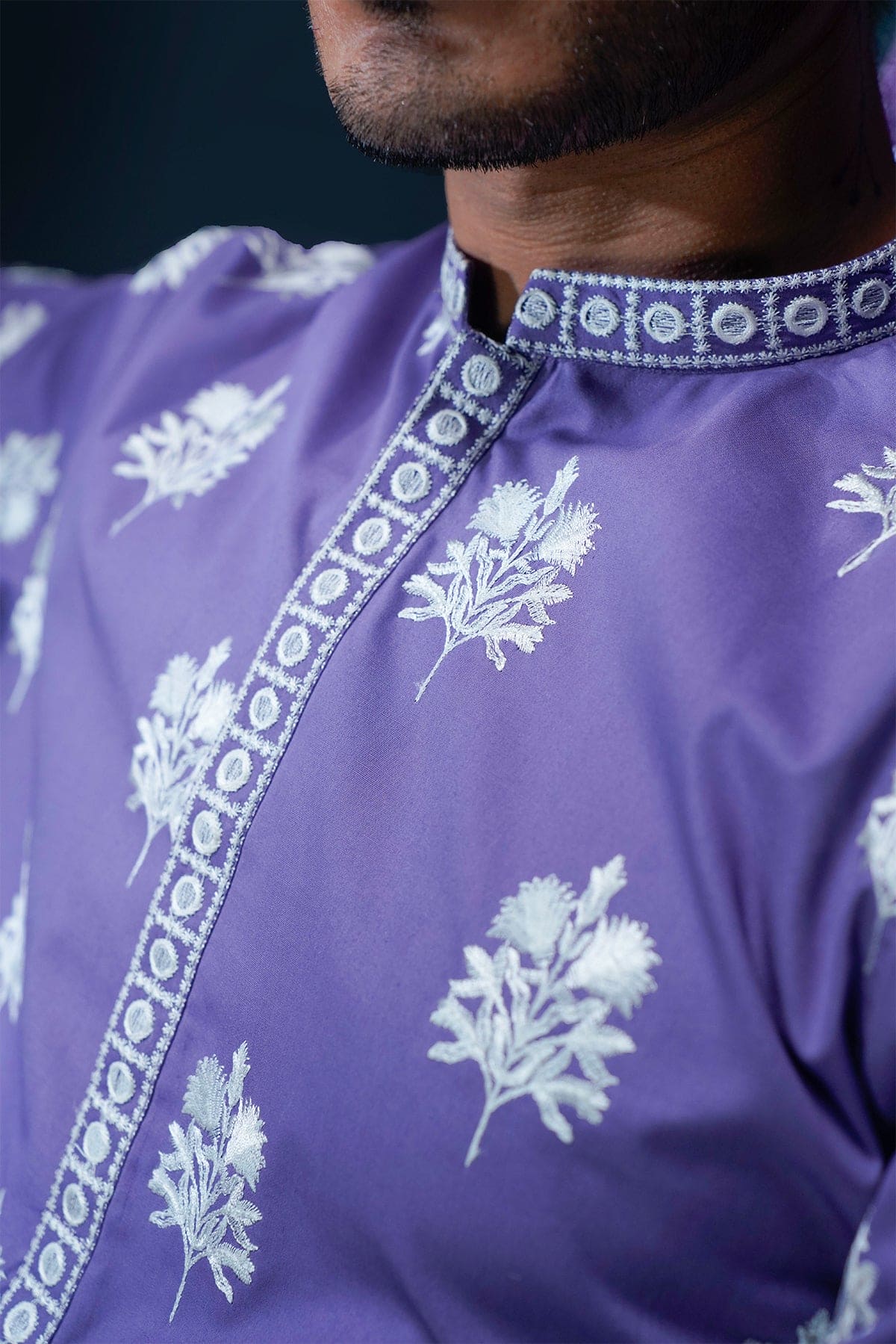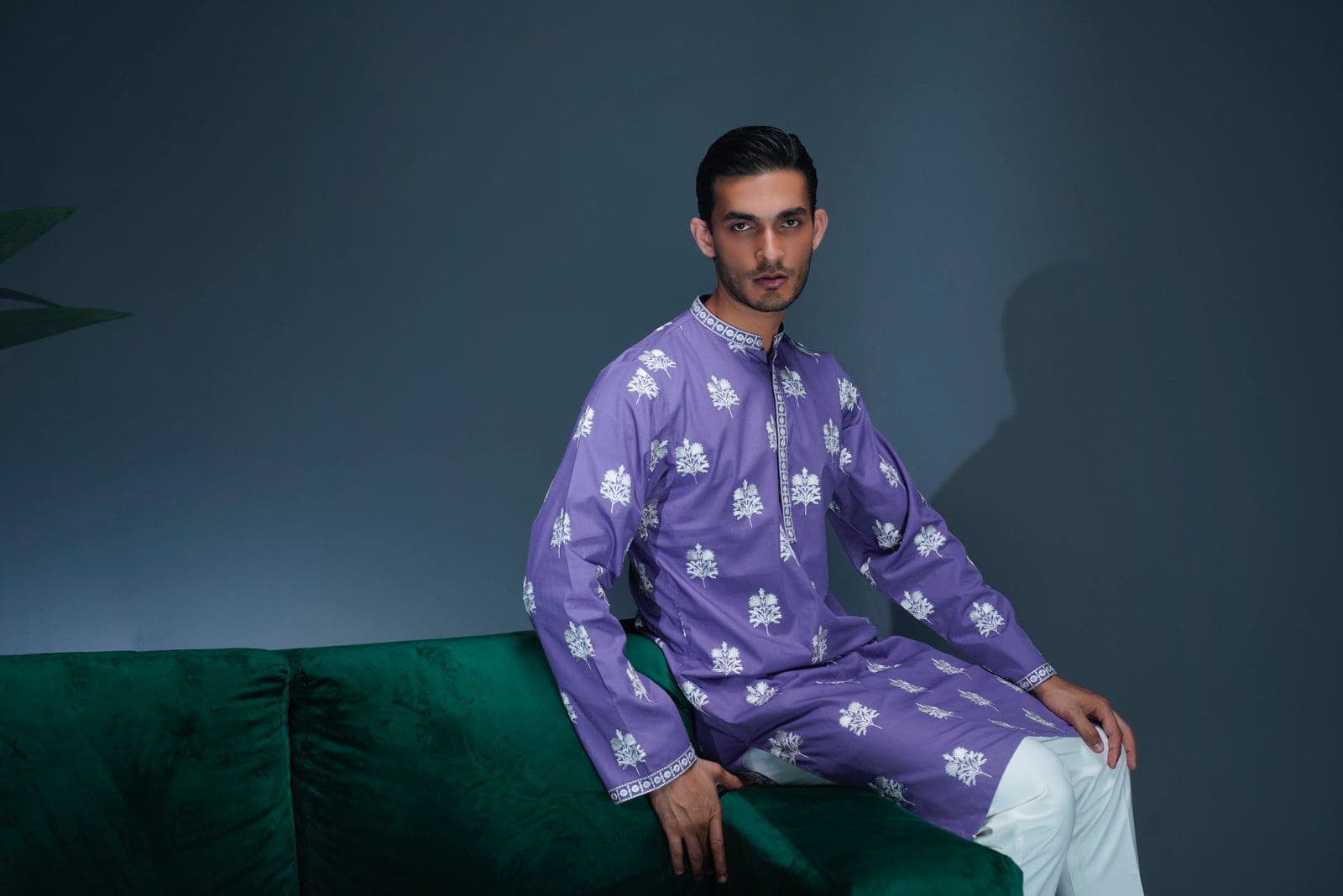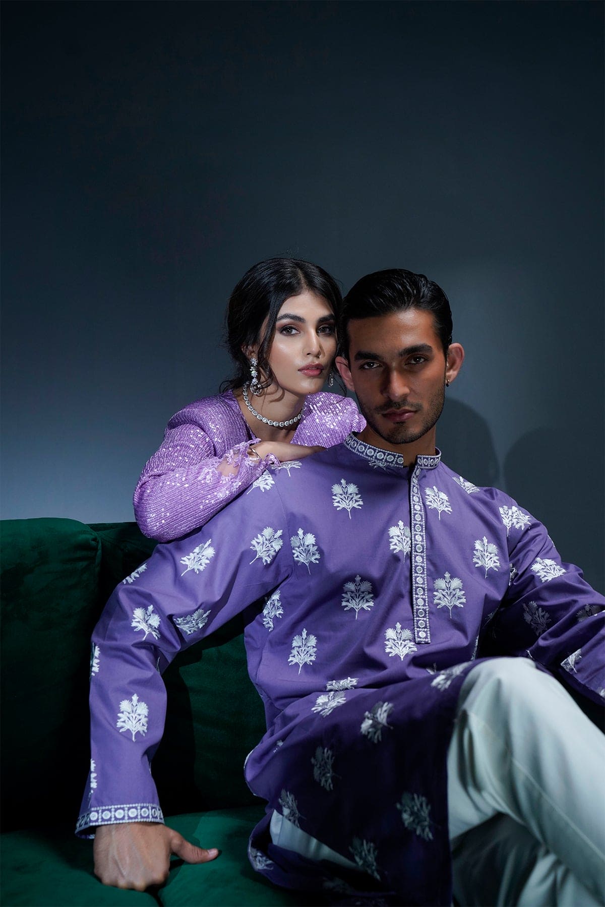 Puhaze by EBDALI is the chic glam color one can opt for too appealing and mesmerizing. The white embroidery balance out the garment and makes it pop on the surface color. Paired with satin pants.